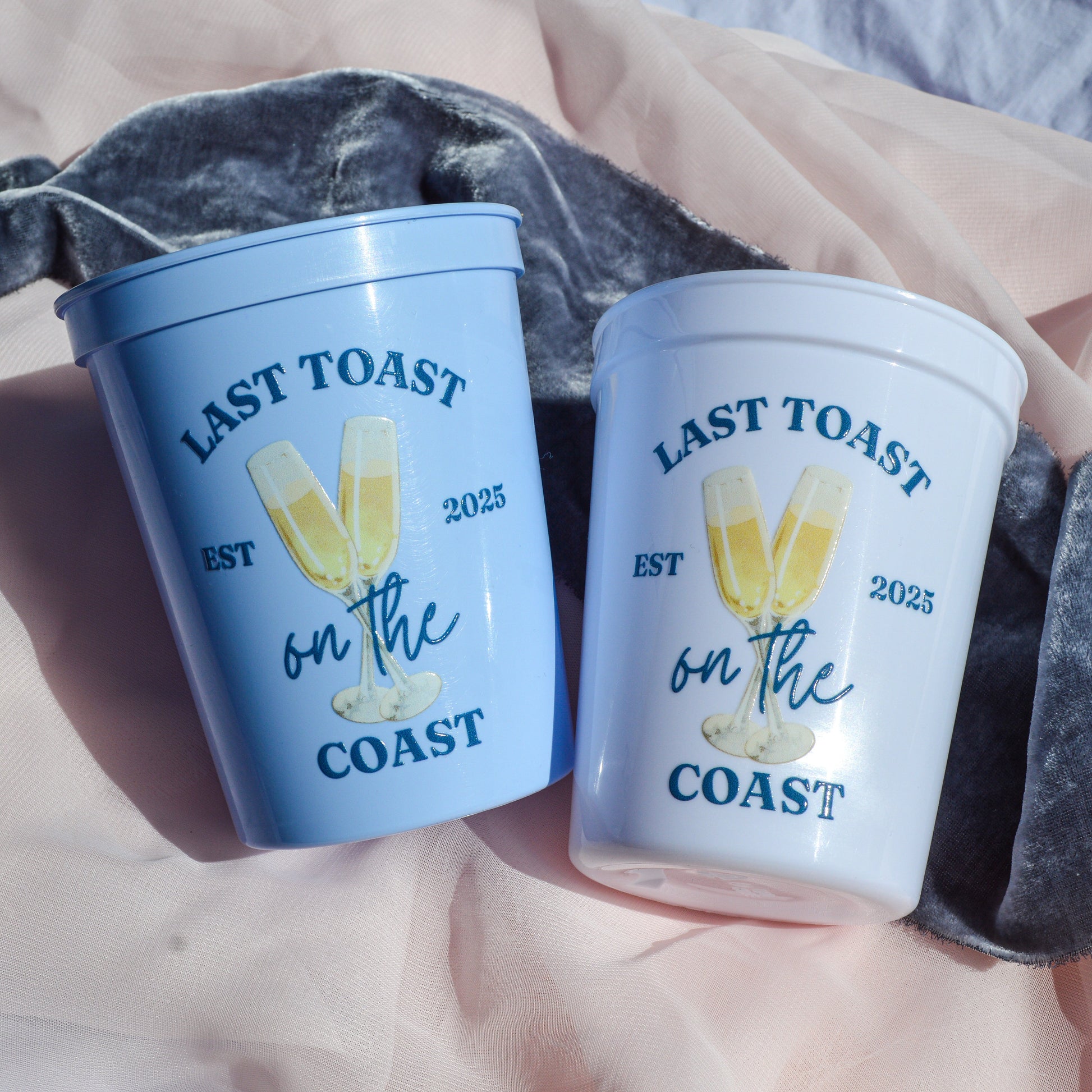 These Last Toast on the Coast cups are the perfect addition to any beach or ocean bachelorette party! The design is clean and cute with toasting champagne pictured in the middle of the cup with Last Toast on the Coast surrounding it. Perfect for any last toast bachelorette party!