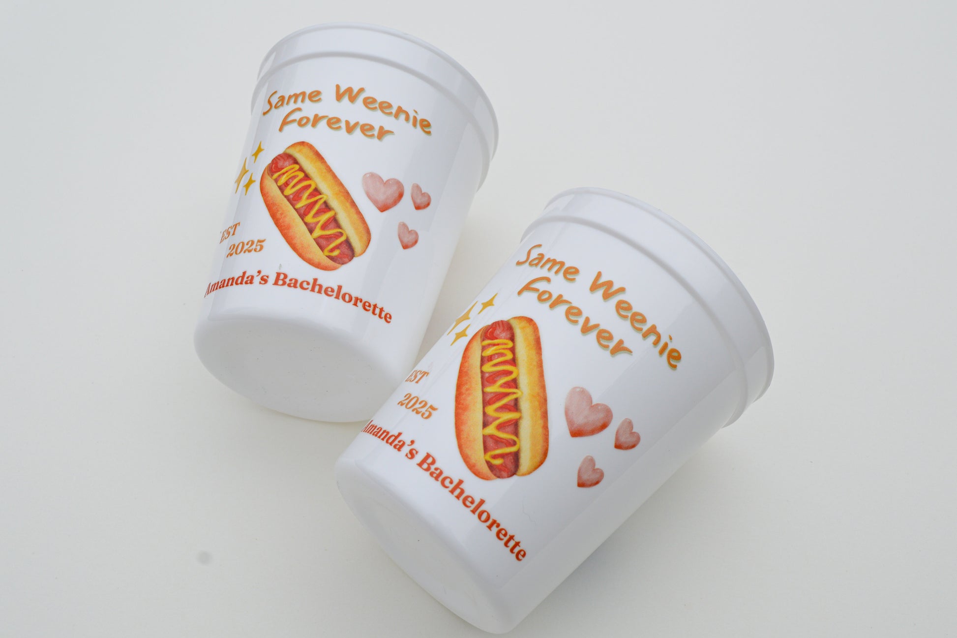 These Custom Same Weenies Forever Party Cups are the perfect addition to your bachelorette party! They are fun and fit into that weenie theme with a fun summer twist! These are cute, on theme, affordable, and re-useable! They're easy to pack for your bachelorette weekend trip and are a fun memento to help you remember all those fun times that may be a little hazy.